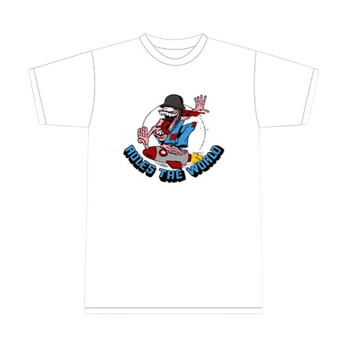 T-shirt blanc avec un imprimé distinctif « Rocketman » sur le devant.